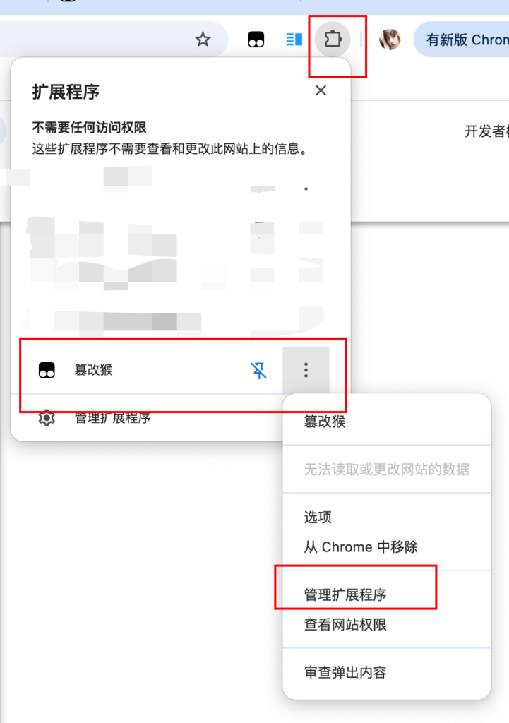 浏览器右上角类似“积木”的图标,点击后在“篡改猴”右边的展开选项,点击‘管理扩展程序“